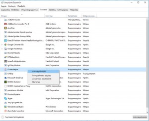 Μπορείτε να εμποδίσετε κάποια προγράμματα να ξεκινούν με την έναρξη των Windows. Για να το πετύχετε πρέπει να κάνετε δεξί κλικ στη γραμμή εργασιών, να επιλέξετε την ένδειξη Διαχείριση εργασιών και κατόπιν να πάτε στην καρτέλα Εκκίνηση. Εκεί κάντε δεξί κλικ στην εφαρμογή που θέλετε να καταργηθεί από τη λίστα αυτόματης εκκίνησης και επιλέξτε Απενεργοποίηση. Εννοείται ότι δεν θα πρέπει να απενεργοποιήσετε σημαντικές εφαρμογές, όπως antivirus. Απενεργοποιείστε μόνο ότι σας φαίνεται περίεργο και δεν το χρειάζεστε. Εξάλλου με τη μέθοδο αυτή δεν απεγκαθιστάτε το πρόγραμμα, απλά το εμποδίζετε από το να εκκινεί μαζί με τα Windows. Εάν θέλετε να το τρέξετε, το βρίσκετε κανονικά στο μενού Έναρξης των Windows.